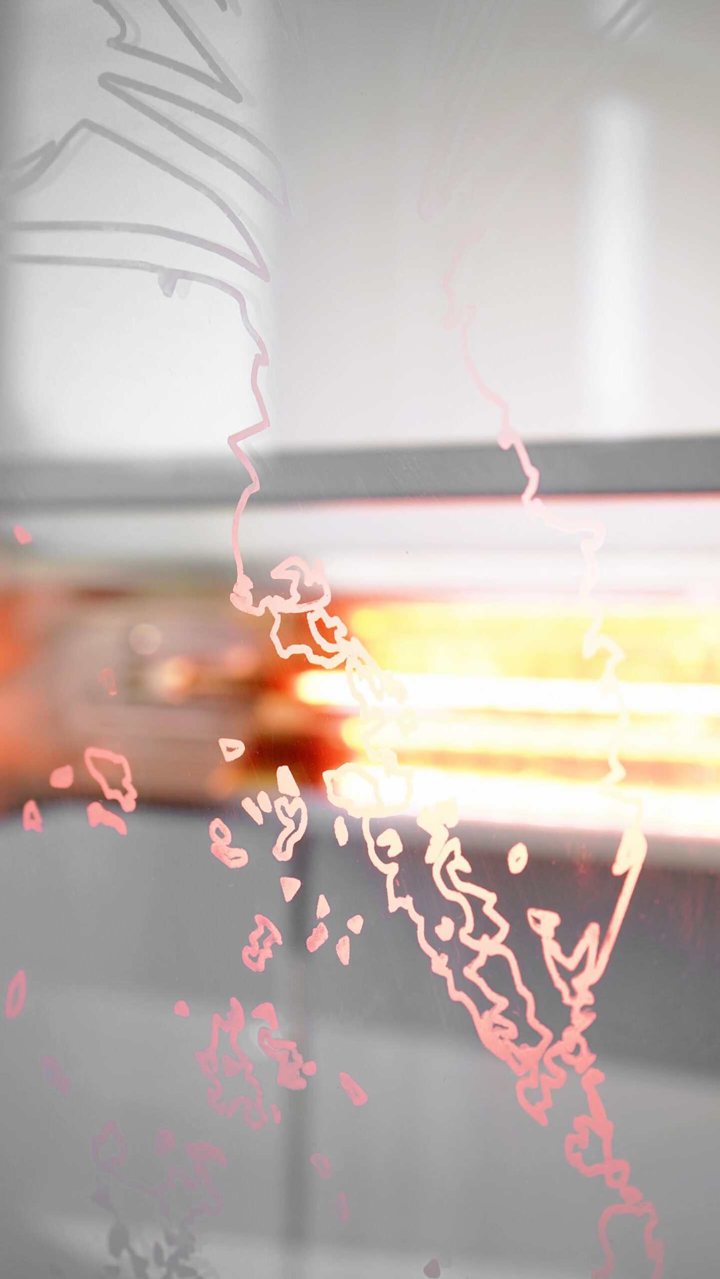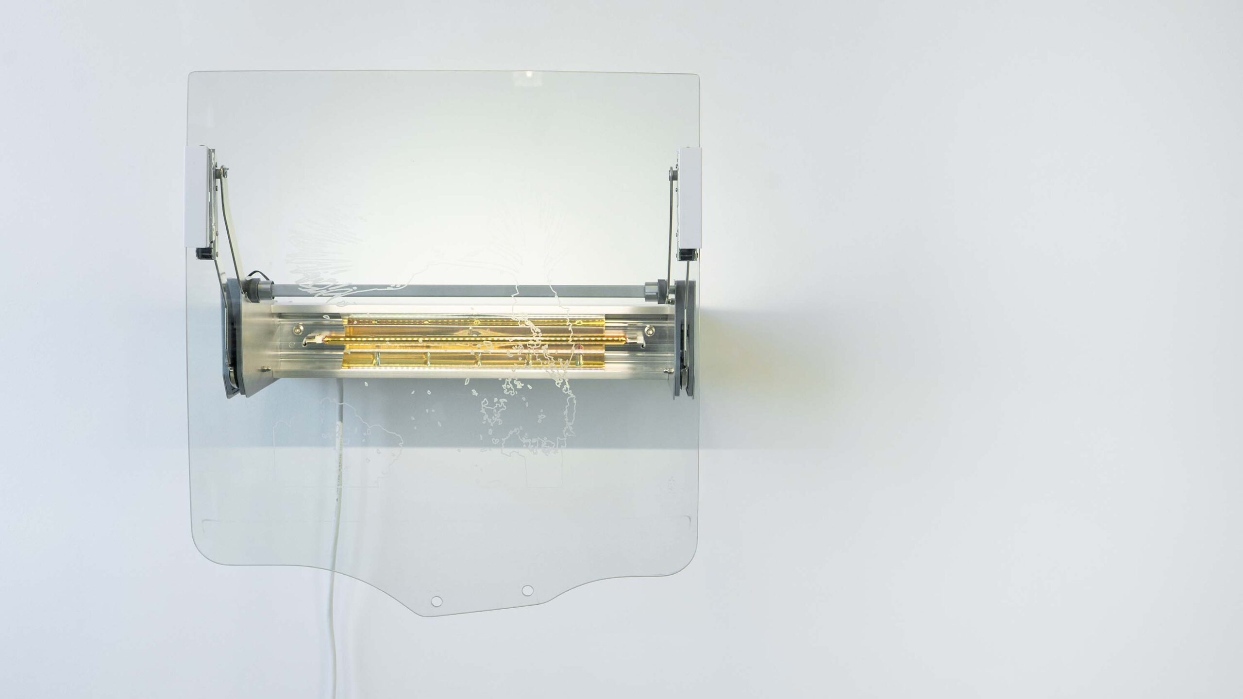 The artwork features a video still of a burning palm tree, etched in fine detail onto glass. As viewers draw close to examine the image, an infrared lamp gradually dims, casting a red glow across the surface and radiating heat that burns on the face. The glass glows with the memory of the fire and in the colors of things to come.
