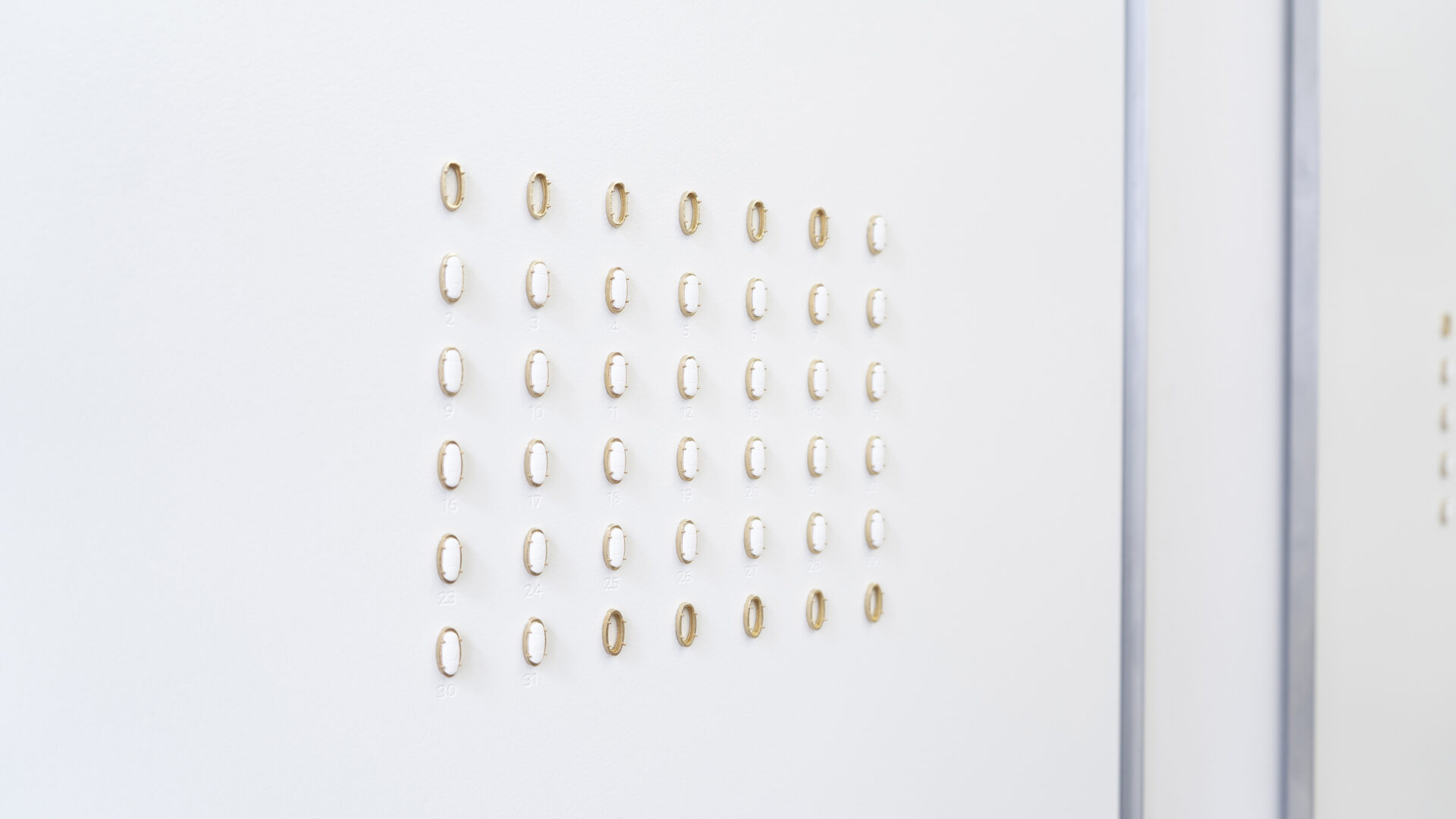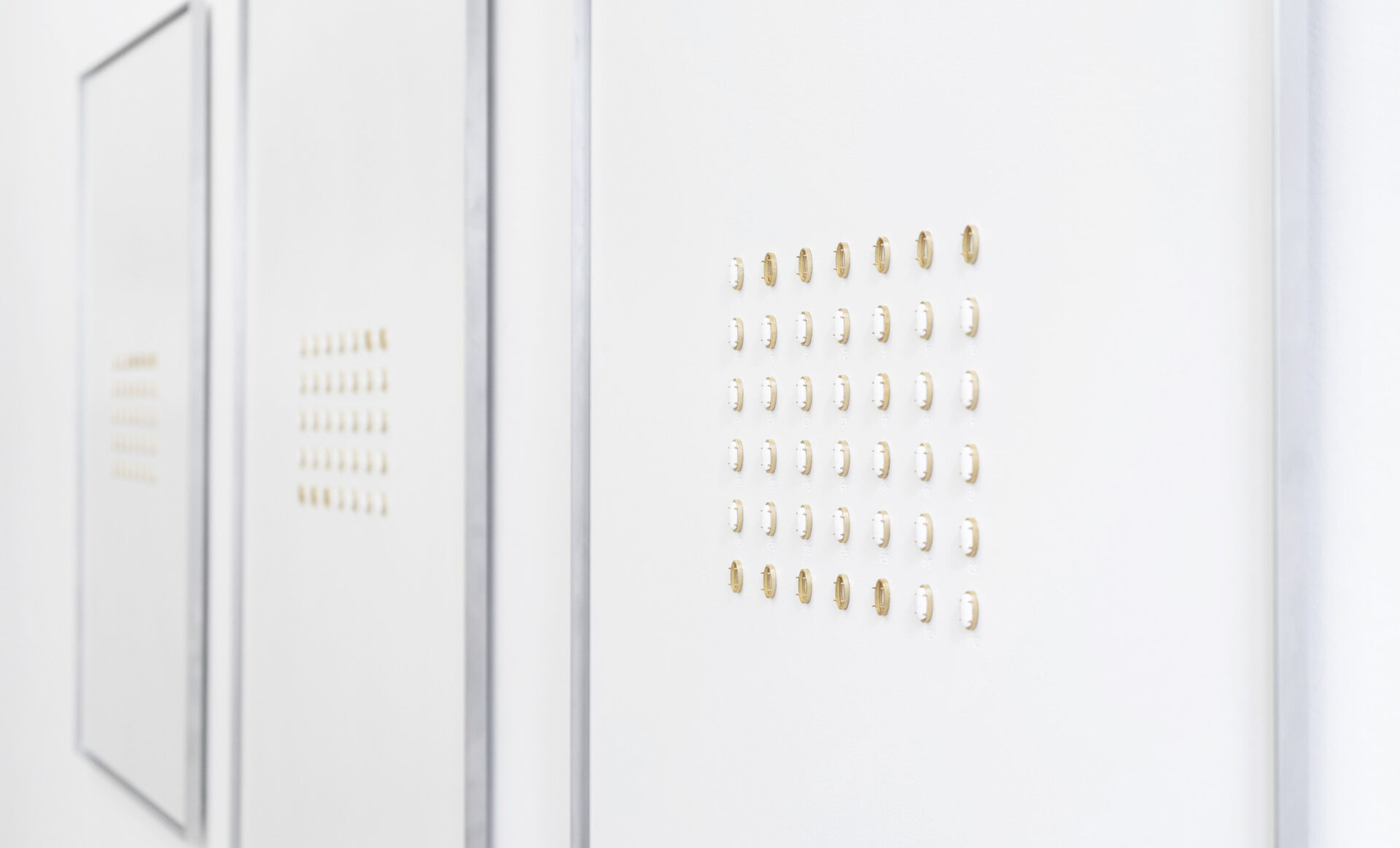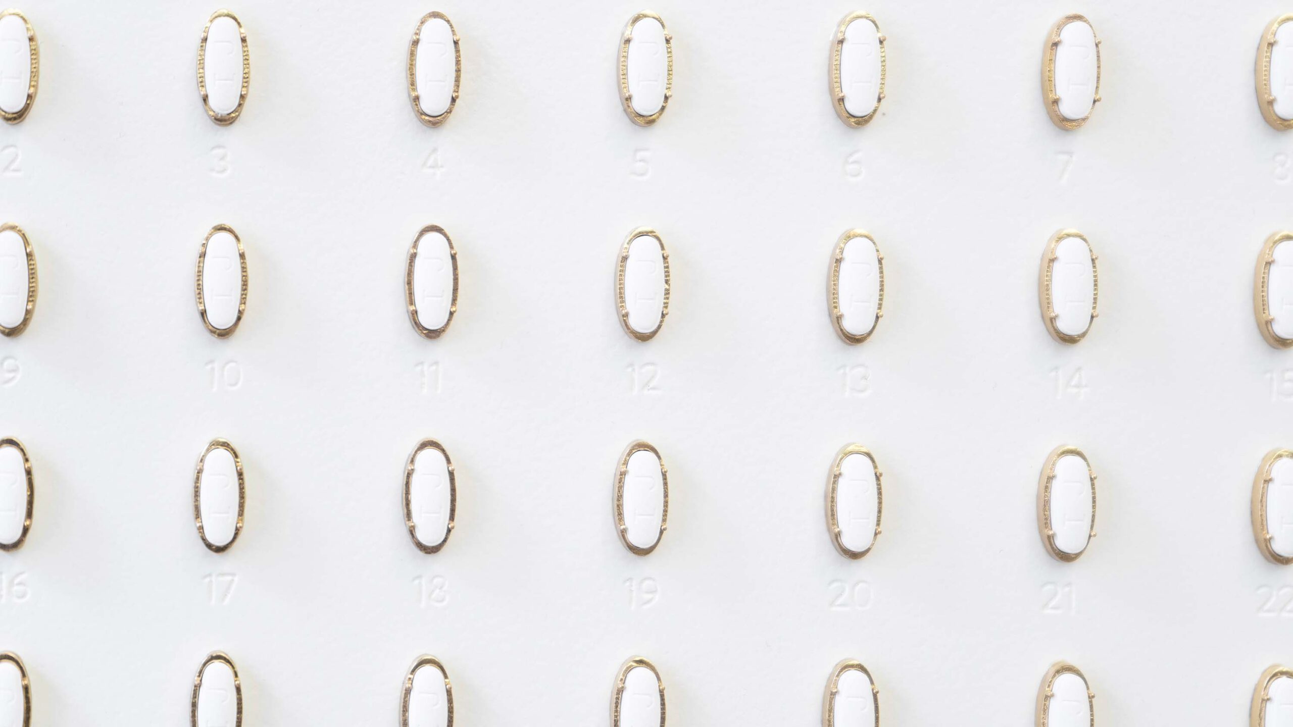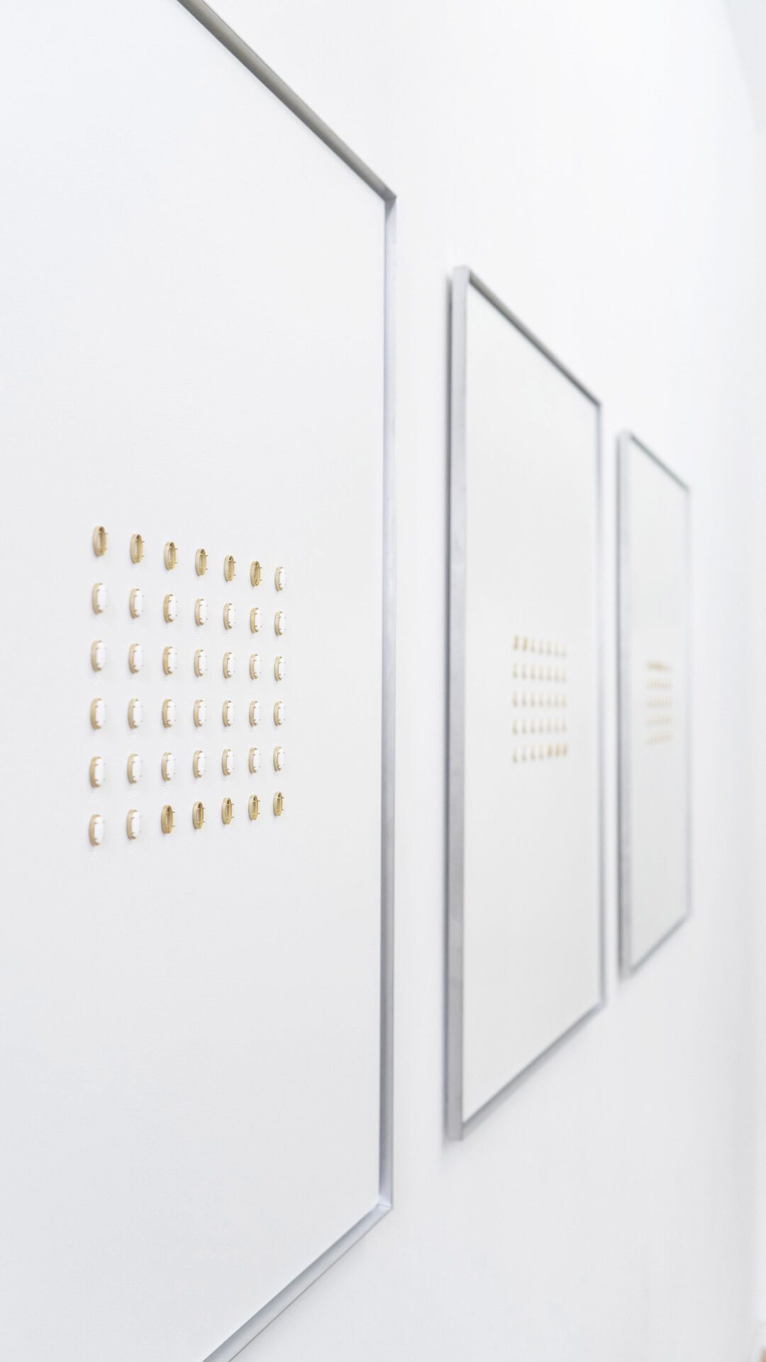 Still life (3/20), (4/20), (5/20)2022 81,4 X 51,4 X 2,2 cm32 X 20.2 X 0.9 inches aluminum, acrylic paint, brass, sertraline 100 mg tablets